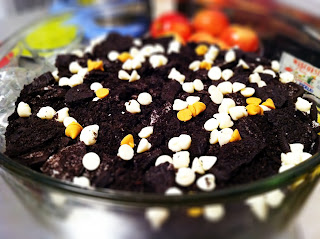 Put the remaining oreos into the processor, and then sprinkle on top. I decided it was a little boring looking all black, because you can't see the pudding, so I sprinkled the top with different chips that I had in my pantry. If I were to make this again, I think I would do a layer of ice cream, and another type of pudding, maybe white chocolate?